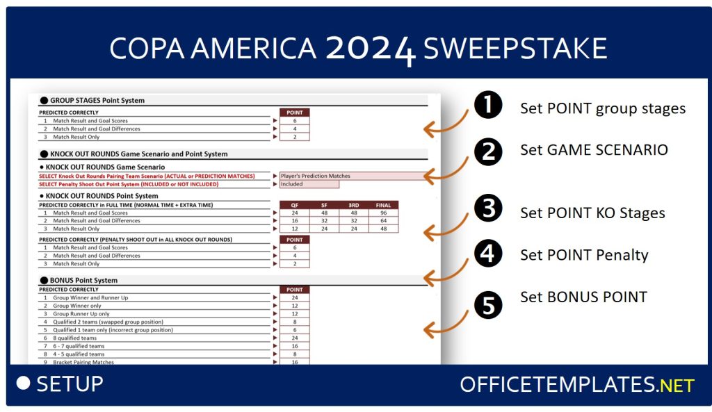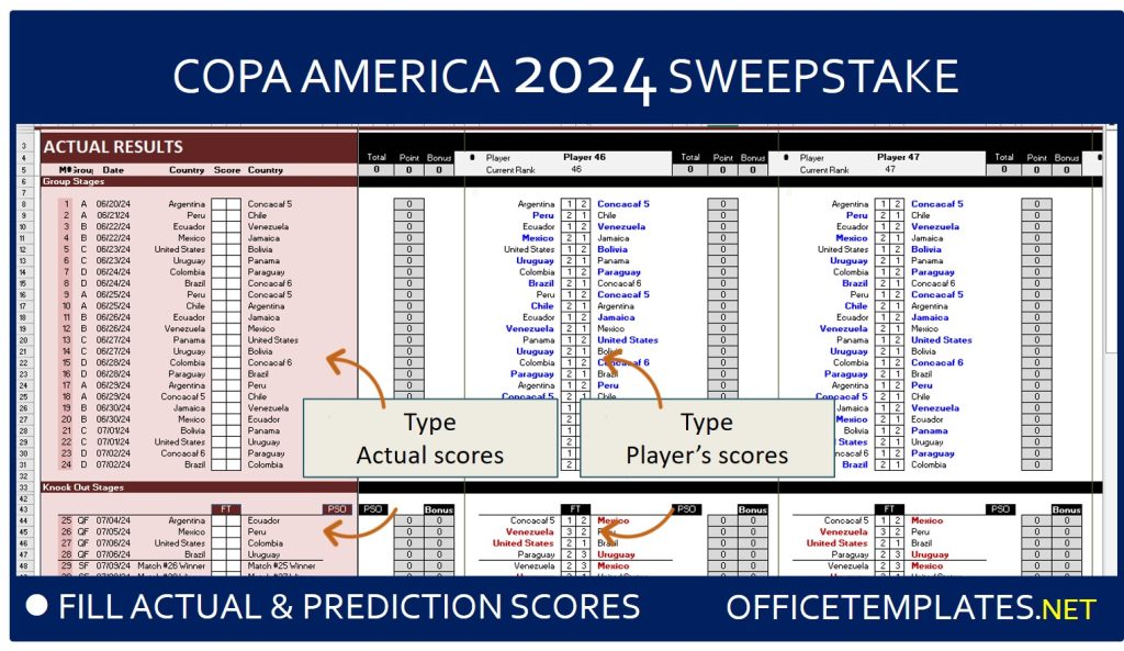 It should be fun to play a prediction game among your friends while watching 2024 Copa America soccer tournament that will be held in USA in June 2024. And by using this Copa America Sweepstake spreadsheet, you don’t have to define rules nor create your own spreadsheet. It is equipped with features and formulas that will help you managing your pool with ease. All you have to do just set the spreadsheet in the beginning, start predicting and collecting score predictions, and let the embedded excel formulas do the rest.