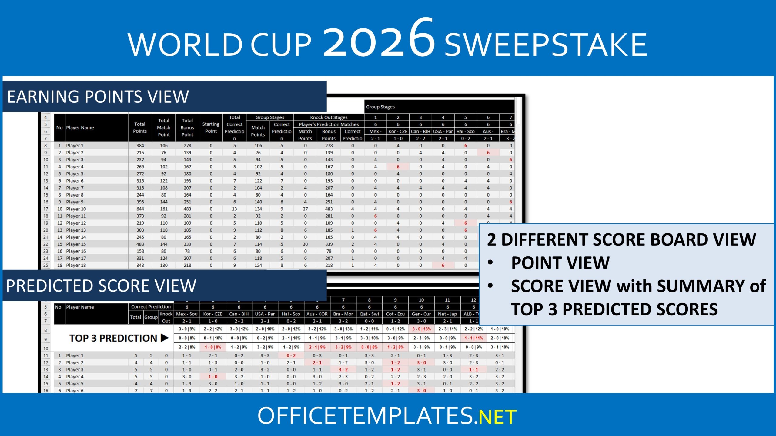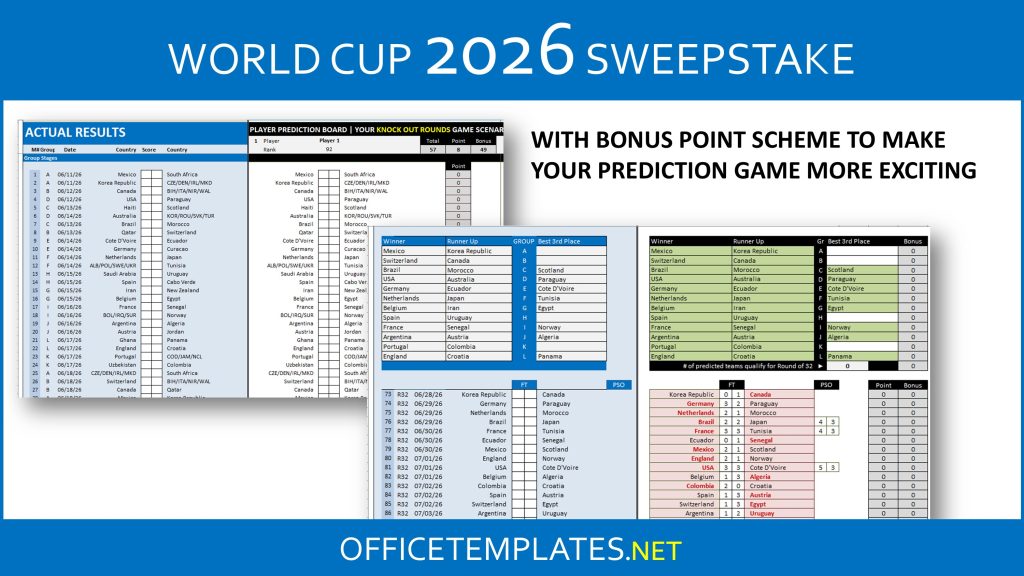 Run your own office pool with this FIFA World Cup 2026 Predictor Game | Sweepstake spreadsheet. It is an Excel template designed for football fans who want to organize a prediction game or office pool during the World Cup that will be held in 3 countries: USA, Canada and Mexico. With this tool, you and your friends, colleagues, or family members can compete by predicting match results and earning points for correct predictions throughout the tournament.