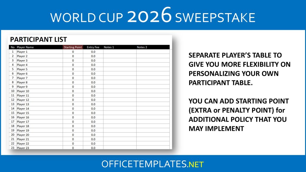 A free version of the FIFA World Cup 2026 Predictor Game and Office Pool spreadsheet can accommodate up to 10 players, although some features are limited. All worksheets in the free edition are protected.